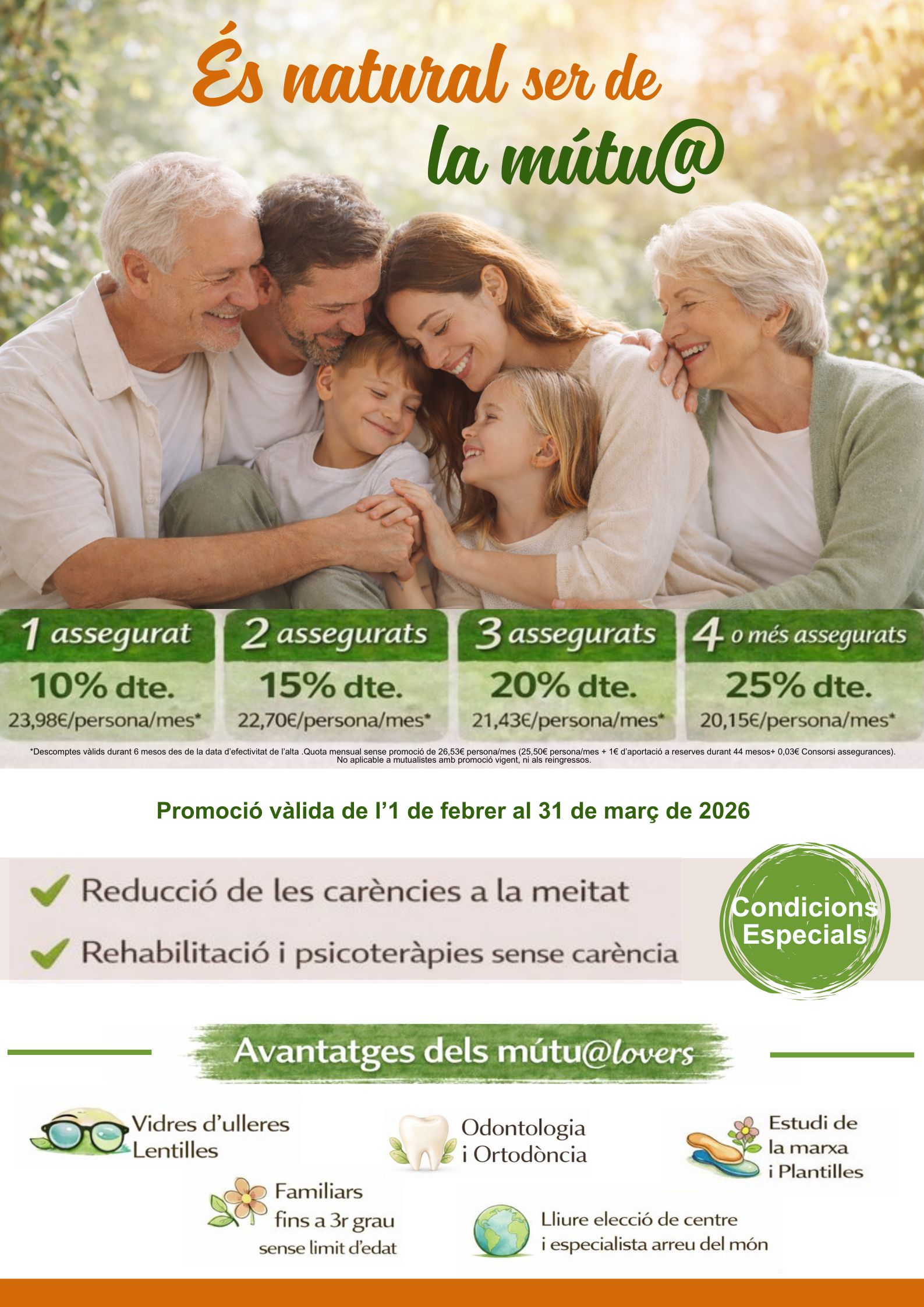Coneix la promoció És natural ser de la mútu@, amb importants descomptes segons el nombre d’assegurats que portis a la Mútua, a més de cobertures sense carència. Descobreix tots els avantatges que tens per venir a la Mútua, no ho dubtis, és natural que hi siguis!