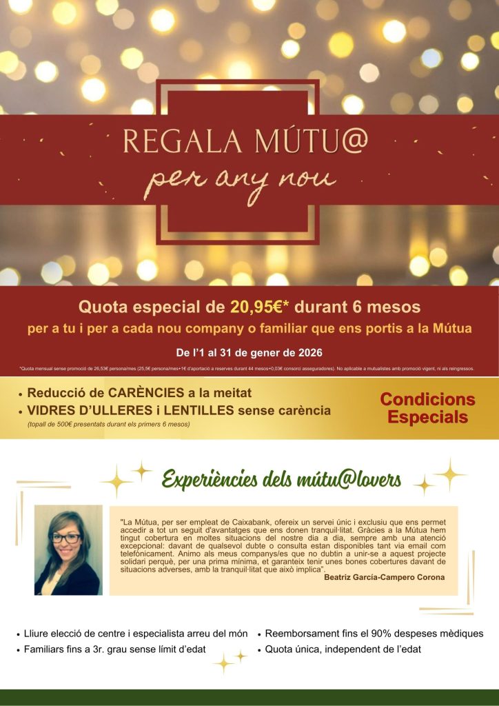 Estrenem el 2026 amb la promoció Regala mútu@ per Any Nou: QUOTA ESPECIAL a més d'algunes cobertures sense carència. Vine i gaudeix de la mútu@!