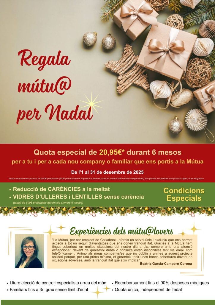 S'acosta Nadal i, com cada any, hem posat en marxa la promoció Regala mútu@ per Nadal amb una QUOTA ESPECIAL, a més d'algunes cobertures sense carència. Vine i gaudeix de la mútu@!
