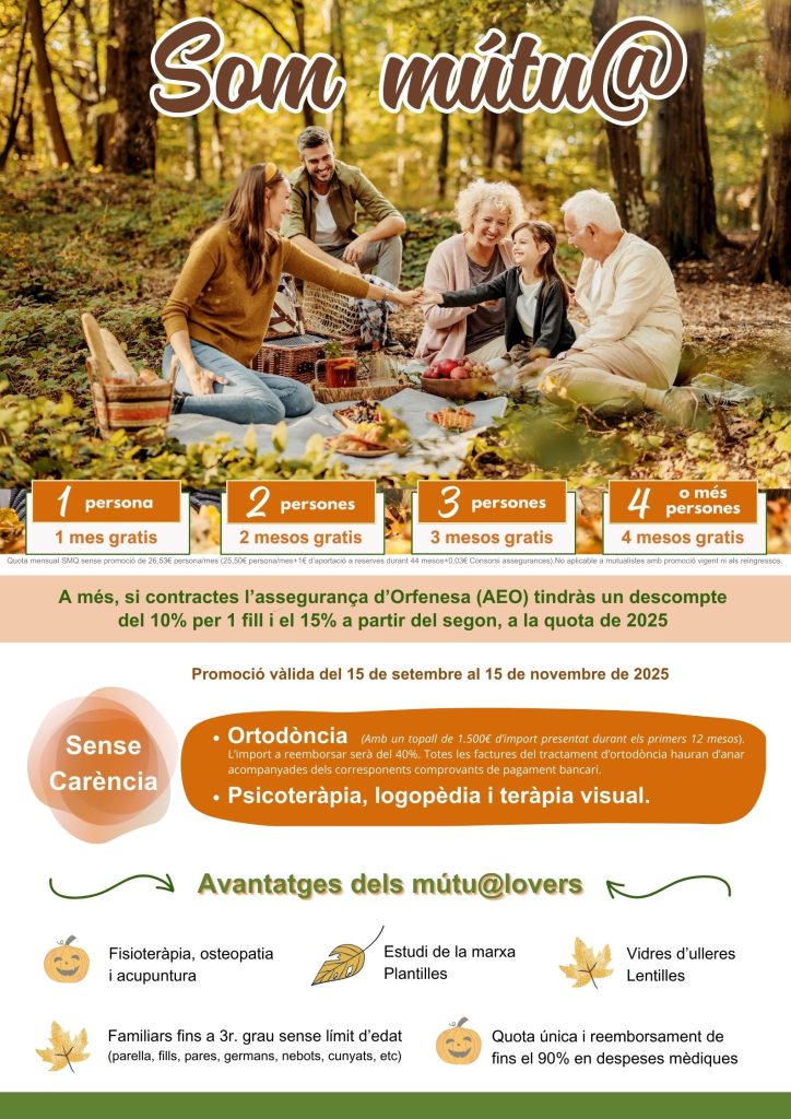 Amb l'arribada de la tardor, hem posat en marxa la nova promoció Som mútu@ amb MESOS GRATIS, a més d'algunes cobertures sense carència. Vine i gaudeix de la mútu@!